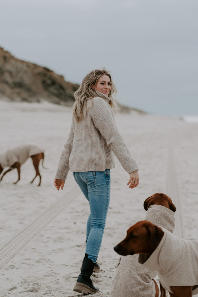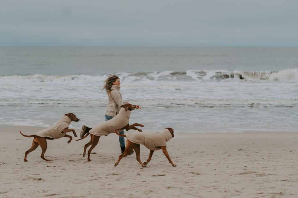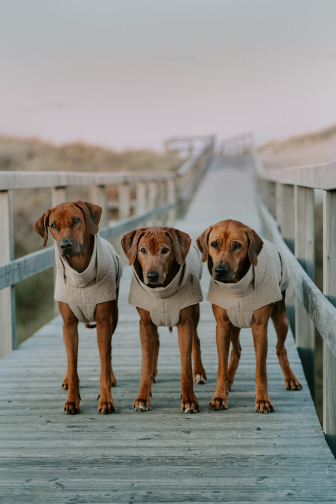 Page, Molly und Penya ließen sich den Wind um’s Näschen wehen und waren glücklich über die langen Erkundungstouren (aber zugegebenermaßen auch, wenn wir wieder drinnen im Warmen waren 😅). Sie lieben Sand unter den Pfoten und konnten an den Stränden richtig Gas geben, buddeln und Möven hinterher jagen. Mein Highlight war eine lange Nachtrunde am menschenleeren Strand, entlang des roten Kliffs. Der Himmel war ganz klar und durch den Mond alles hell erleuchtet. Das sah so magisch aus! Zurück ging es auf einem schmalen Pfad durch die Dünen. Aber wir haben nicht nur die Strände erkundet, sondern auch gemütliche Stunden in den kleinen Cafés verbracht. Abends wurde dann immer daheim gekocht und mit einer neu entdeckten Sylter Weinschorle auf den Tag angestoßen. Genau so haben wir uns das vorgestellt. Ahja, und: Die Kamera von Hannah war auch fast immer dabei, und so hat sie die schönsten Momente festgehalten.